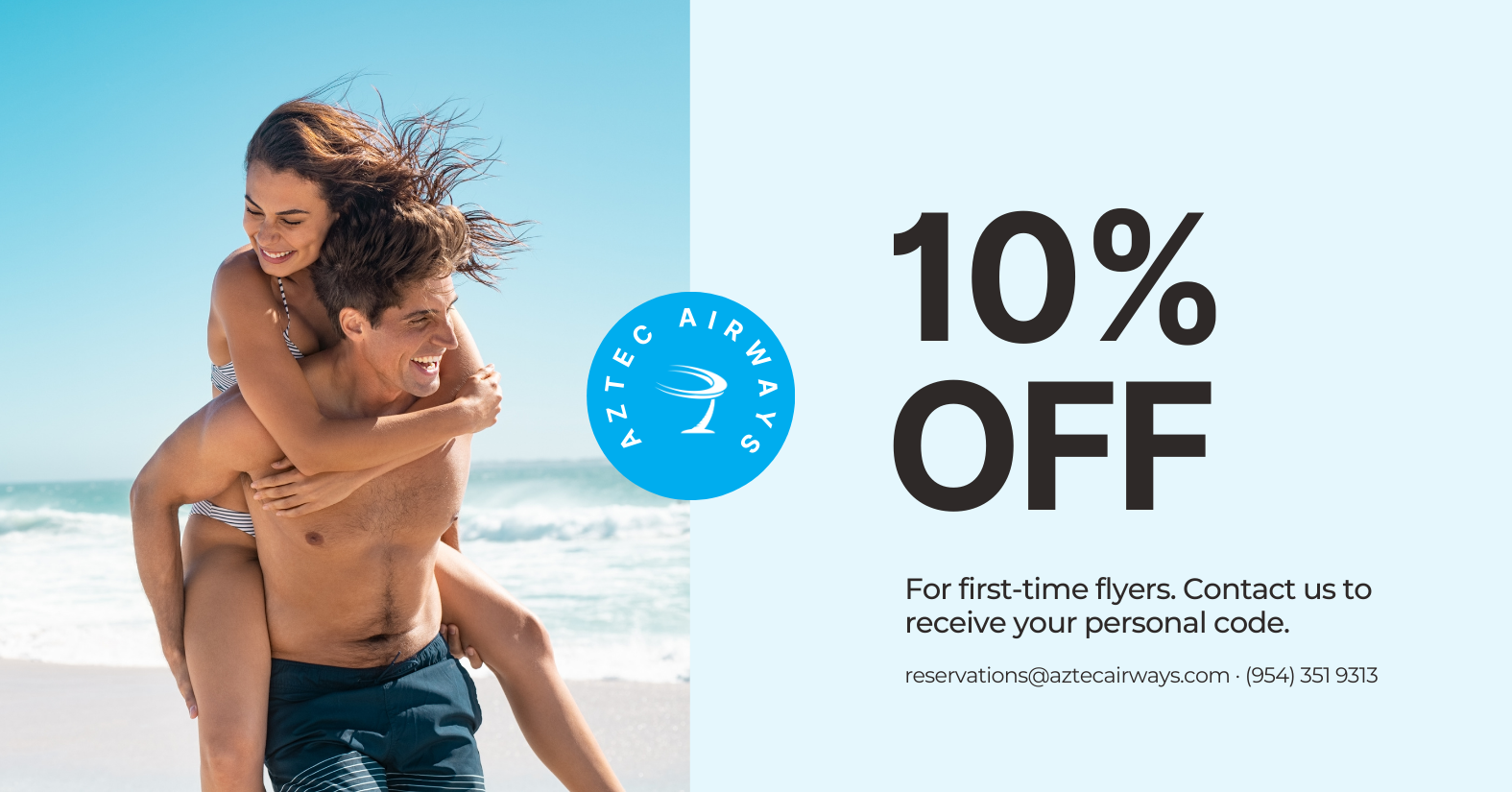 Aztec Airwyas: As a welcome to new passengers, take 10% off your first booking and experience a smoother, more reliable way to travel. Offer valid for first-time passengers only. Discount applies to the scheduled flight base fare. Additional terms and conditions may apply.